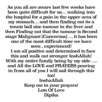 Describing the past few weeks as the most difficult time her family has faced, Dipika expressed gratitude for the love and prayers pouring in from her fans. She remains positive and determined to overcome this health challenge, stating, “I will sail through this too, InshaAllah.”
